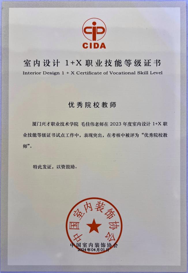 在刚刚结束的2023年度“1+X”室内设计职业技能等级证书试点工作中,我校艺术与建筑学院表现卓越,荣获中国室内装饰协会颁发的“优秀试点院校”称号。同时,李娜、毛佳伟两位教师被评为“优秀院校教师”。这是继2022年后,我校再次获此殊荣,充分体现了学校在室内设计教育领域对“1+X”职业技能等级证书考证工作的高度重视和取得的显著成果。