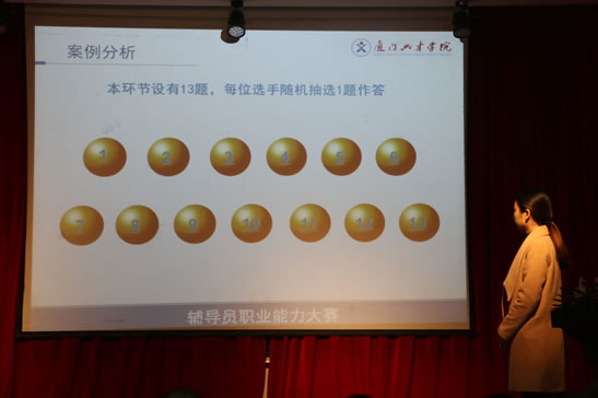 本次大赛分为初赛和决赛两个阶段,共有八个项目。初赛有基础知识测试、博文写作、班情熟知、主题班会和演讲比赛等项目,决赛包括案例分析、谈心谈话和评建知识竞赛等项目。全体辅导员参加初赛,表现均可圈可点,展示了我校辅导员队伍较高的职业素养。经过选手们的激烈的角逐和工作组老师的严格评审,共有13名辅导员进入决赛,其中1名选手来自管理学院,3名选手来自商贸学院,3名选手来自艺术与建筑学院,4来自工学院,2名选手来自教育学院。