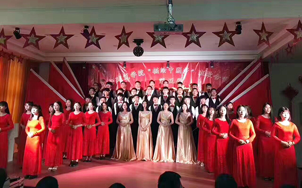 随后六支队伍通过形式多样的演唱表演方式分别完成了必唱曲目《走向复兴》和自选曲目。比赛气氛活泼紧张,各班学子极尽所能展现各自风采,他们以高昂的热情、出众的才艺博得了台下老师同学们的阵阵喝彩。来自16级建工和造价专业的“追梦队”以其颇具民族风格的演唱形式、精美的少数民族服装,精心演绎《相亲相爱》,体现了班集体团结奋进的精神风貌。
