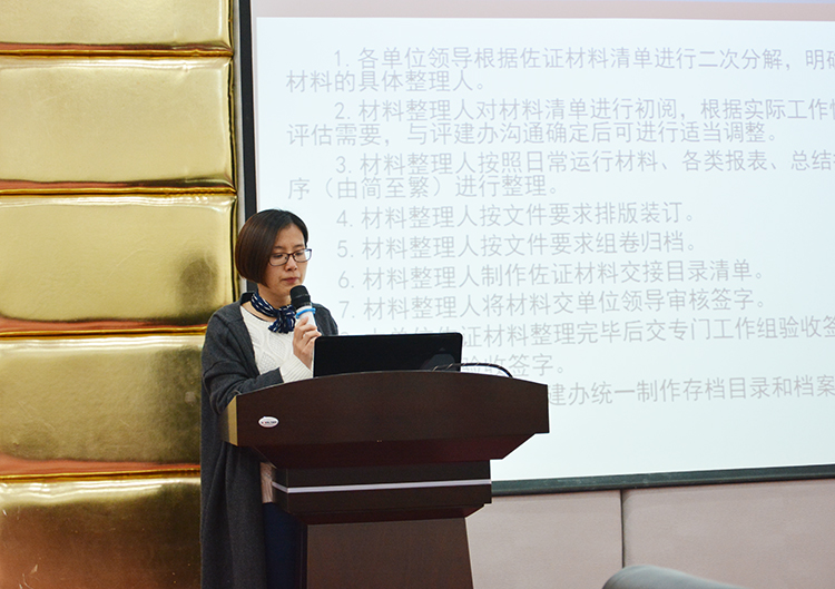 二轮评估佐证材料是我校教育、教学工作状态、过程和水平的直接体现,评估材料准备过程是“迎评促建”工作非常重要的一个环节,为确保我校二轮评估佐证材料收集与整理工作做到全面、准确,2月7日上午,评建办在中心会议室召开二轮评估整理材料工作培训会。学校各单位主要负责人、秘书参加了培训。培训由评建办副主任潘秋勤主讲。