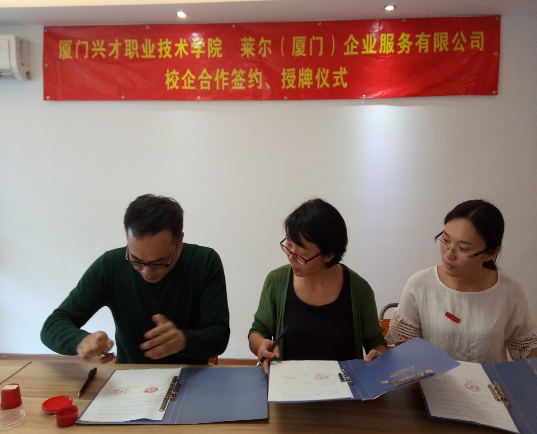 2017年4月17日下午,管理学院彭晓娟副院长、会计教研室专业带头人陈晓珊老师受邀前往莱尔(厦门)企业服务有限公司签署校企合作协议,并授予该公司“实践基地”牌匾。